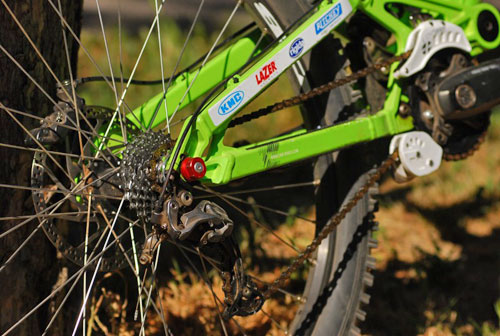 Geometria cadrului diferă în totalitate de cea veche, lucru ce ne-a dat multe bătăi de cap. Butucul din faţă şi spate am reuşit fără nici o problemă să le montăm în locaşul lor nou, însă lista componentelor care au putut fi transferate fără modificări se şi opreşte aici. La piesele noi, am ţinut cont şi de culoare, aşa că avem doar trei culori: verde, alb şi negru.